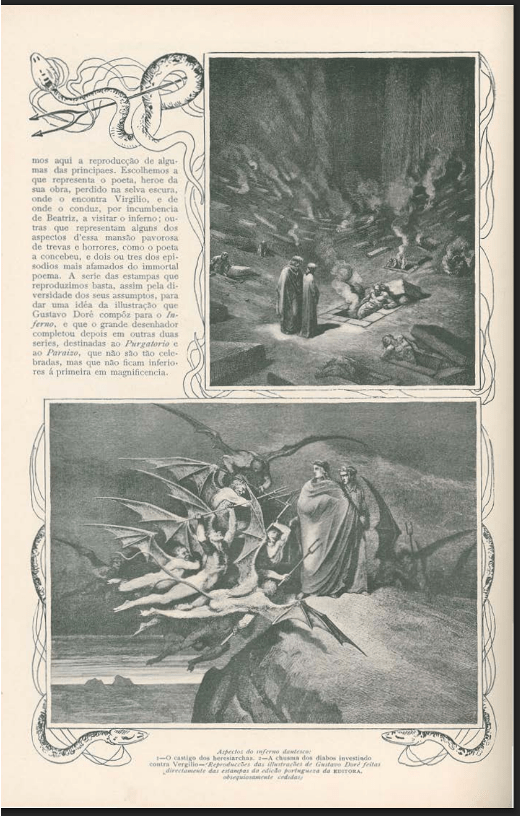 Em 1909, num Portugal marcado por forte anticlericalismo e por manifestações nas ruas contra o clero, a publicação, na Ilustração Portugueza, de um artigo sobre o Inferno de Dante, ilustrado por Gustavo Doré, revela muito da auto‑imagem cultural da época: recupera-se a figura do poeta exilado, cansado das fações e das alianças entre poder político e religioso, como modelo de intelectual crítico; apresenta-se o Inferno como arquitetura moral rigorosa, onde príncipes, prelados e poderosos são julgados por uma ordem superior à das instituições; e oferece-se ao público urbano um acesso moderno, visual e prestigiante a um clássico europeu que permite, de forma discreta, ressoar com um imaginário de denúncia de abusos de poder – também os que vestem batina – sem recorrer ao tom panfletário, conciliando, assim, ambição de alta cultura, vontade de laicização e fascínio pelo macabro organizado num “tribunal” simbólico de justiça poética.