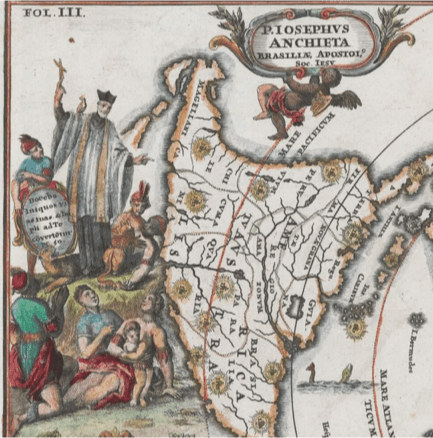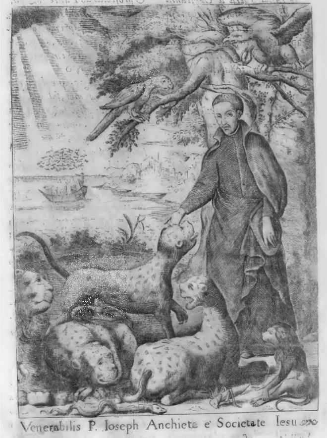 Imagem de José Anchieta da biografia de Simão Vasconcellos, Vida do veneravel padre Ioseph de Anchieta da companhia de jesvs,taumaturgo do novo mundo, na província do Brasil. Lisboa: Ioam da Costa, 1672. Acesso online através de http://www.archive.org