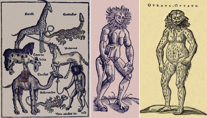 Da esquerda para a direita: os animais da Terra Santa segundo as “Peregrinationes in Terram Sanctam” de Bernhard von Breydenbach (1486), o “sátiro” da “Historia Animalium” de Conrad Gesner (1551) e o “orang-outang” da “Historiae Naturalis & Medicae Indiae Orientalis” de Jacobus Bontius (in Piso, 1658).