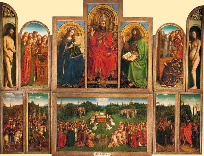 “Retábulo de Ghent”, composto por 12 painéis, considerado a primeira grande pintura a óleo a ganhar admiração mundial. Ao centro inferior, a “Adoração do Cordeiro Místico”, pintada pelos irmãos Van Eyck, em 1432. KIK-IRPA, Brussels, Belgium (o retábulo do altar de Ghent começou a ser pintado em 1420 por Hubert van Eyck, morto seis anos depois, sendo terminada por seu irmão mais novo Jan, em 1432).