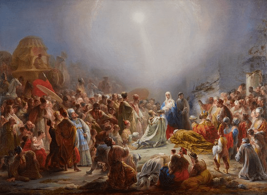 Entrando na casa, viram o menino com Maria, sua mãe, e, prostrando-se, adoraram-no; e abrindo os seus cofres, fizeram-lhe ofertas de ouro, incenso e mirra.