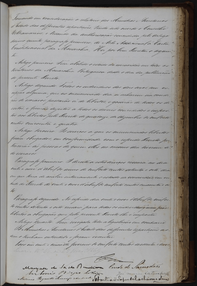 Alvará pelo qual Vossa Majestade, agindo conforme o conselho, determina o fim do abuso existente no Reino do Algarve e em algumas províncias de Portugal quanto ao cativeiro. Considerando que atualmente já não se pode manter tal prática, declara que todos os que nascerem após a publicação desta lei serão, por benefício dela, naturalmente livres. E que os libertados por este decreto ficarão habilitados para todos os ofícios, honras e dignidades. Assim se manda cumprir.