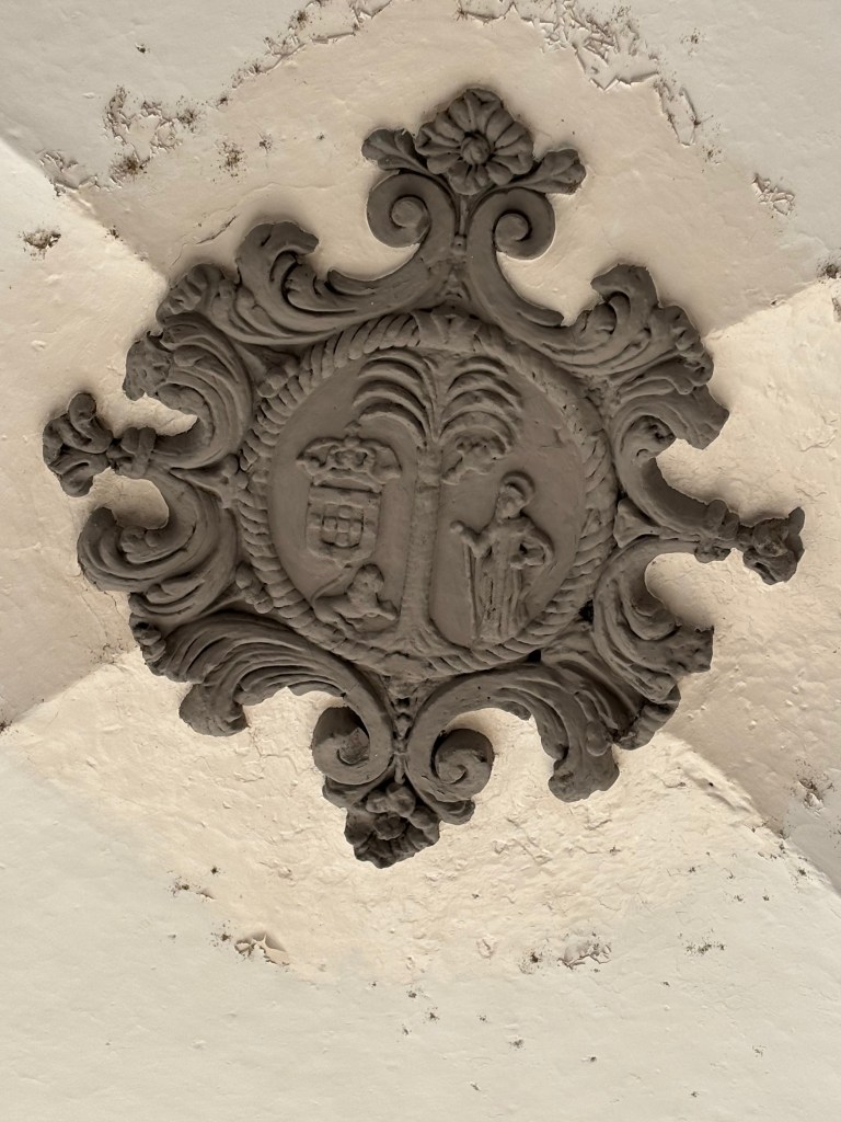 A escolha de São Paulo, o Eremita, para decorar a galilé é reveladora. A galilé funciona muitas vezes como espaço de passagem, de recolhimento e de preparação simbólica para a entrada no templo, o que se harmoniza bem com a memória de um santo que fez da retirada do mundo o caminho para Deus. A cartela, com a sua moldura barroca de volutas e ornatos vegetalistas, reforça ainda essa dimensão estética e catequética, tão característica da arte sacra.