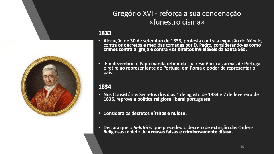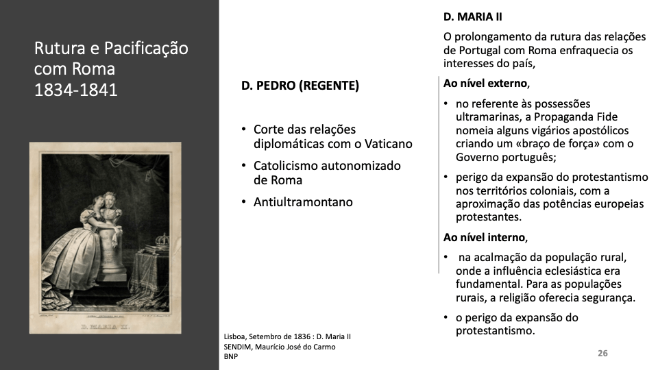 Veja-se, VEIGA, Francisca Branco (2019, nov.). 1832-1834 Regência de D. Pedro em nome de sua filha D. Maria da Glória: fim do governo temporal da Igreja Católica e das Ordens Religiosas em Portugal. In SOARES, Clara Moura; MALTA, Marize (eds.), D. Maria II, princesa do Brasil, rainha de Portugal Arte, Património e Identidade, Lisboa: Palácio Nacional da Ajuda, 12 nov. (pp. 113-120). ARTIS – Instituto de História da Arte da Faculdade de Letras da Universidade de Lisboa.