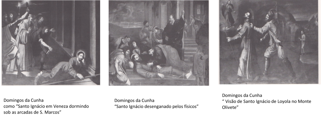 Para pintar estas telas o pintor Domingos da Cunha utilizou as gravuras da Vita Beattii Patris Ignatii Loyolae Religionis Societatis Iesu Fundatoris ad Vivum Expressa ex ea quam, de P. Petrus Ribadeneyra, publicada em 1610 por Cornelis Galle, em Antuérpia, com dezasseis buris de Cornelis e de Theodore Galle, de Adrien e Johann Collaert e de Charles de Mallery[13]. Mas nota-se outras influências, ao nível estético, com alguma modernidade, saído dos modelos «caravagescos». É visível ao nível pictórico um desequilíbrio, mostrando que, possivelmente, um colaborador seu também participou nesta construção[14].