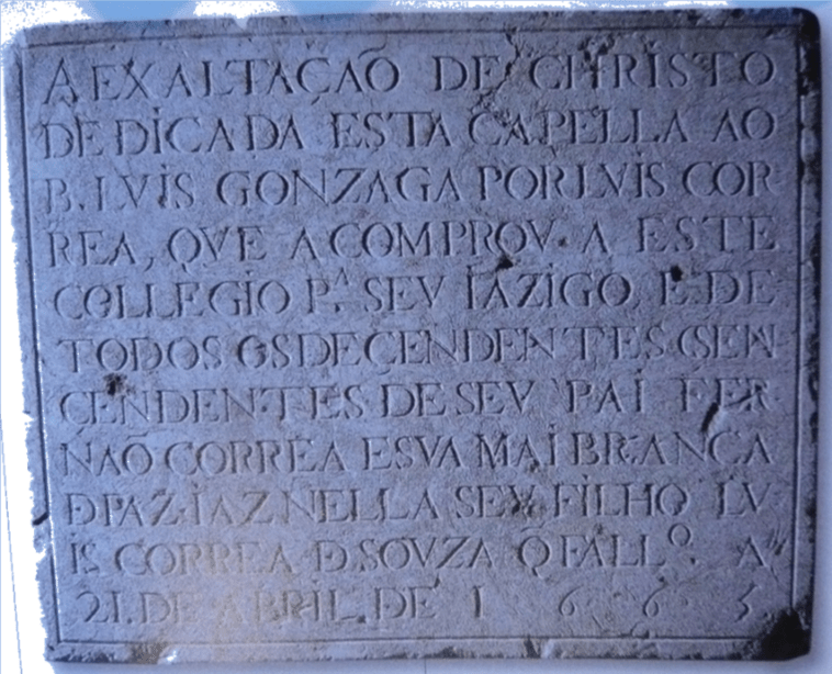 [Á EXALTAÇÃO DE CHRISTO/ DEDICADA ESTA CAPELA AO/ B. LUVIS GONZAGA POR LUIS COR/ REIA Q.DO A COMPRO A ESTE/ COLLEGIO PARA SEV JAZIGO E DE/ TODOS OS DESCENDENTES E AS/ CENDENTES DE SEV PAI FER/ NÃO CORREIA E SVA MAI BRANCA/ DA PAZ E IAZ NELLA SEV FILHO LV/ IS CORREIA DE SOVSA Q. FALECEV A/ 21 DE ABRIL DE 1665][10].