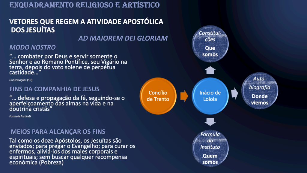 Não tendo como pretensão o estudo aprofundado da iconografia na Companhia de Jesus, achei conveniente mostrar que um programa cultual e de doutrinação teve como consequência a criação de uma arte religiosa muito própria da Companhia de Jesus ao nível da arquitetura, da pintura, da escultura, da ourivesaria.