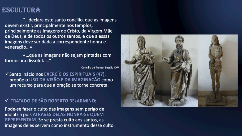 As normas saídas do Concílio de Trento foram adotadas pela Companhia de Jesus a todos os níveis, incluindo as relativas à Invocação e Veneração das Relíquias dos Santos e das Sagradas Imagens. Inácio de Loyola afirmava que: «Louvar os ornamentos e edifícios das igrejas. Do mesmo modo as imagens. Venerá-las segundo o que representam».[a]